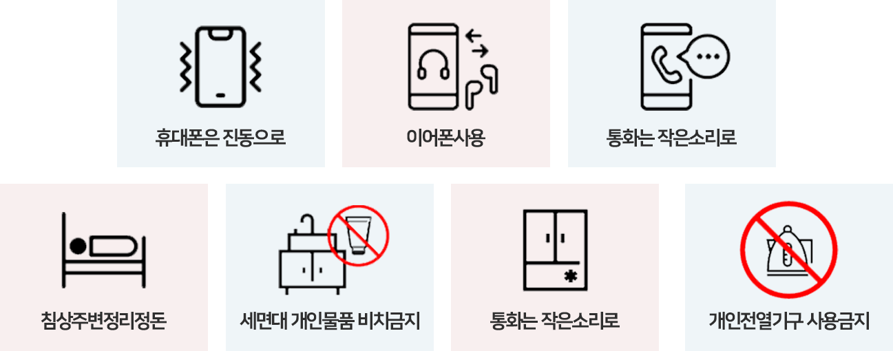 - 침상 주변을 정리 정돈하고 화장실, 세면대에 개인 물품을 비치하지 않습니다.