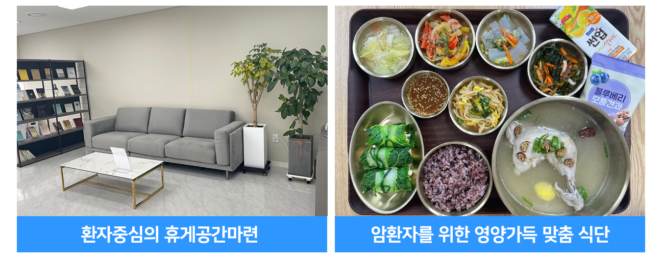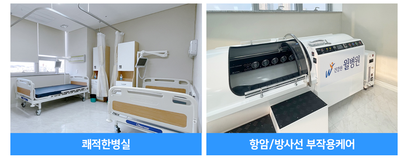 건강한윌병원은 적절한 영양, 치료를 고려할 뿐만 아니라 맛까지 신경 쓴 최상의 식단을 제공하면서 다양한 면역치료 프로그램을 통해 면역력과 체력, 부작용 증상을 케어할 수 있는 병원으로 환자분들의 면역력 회복을 위한 고단백, 저지방, 고영양 식이관리 맞춤식단을 준비하며 양질의 적잘한 영양 공급을 위해 환자 상태에 맞는 위절제식, 당뇨식, 저요오드식 등 전문적인 치료식을 제공하고 있습니다.