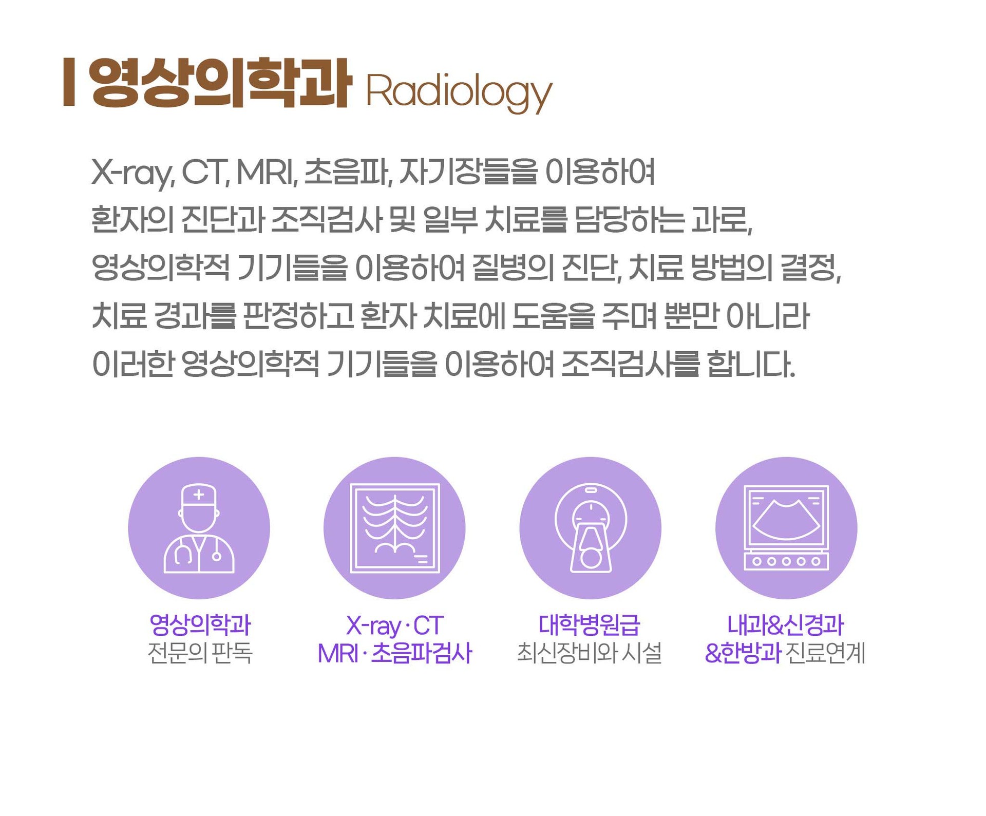 영상의학과는 X-선 검사, 초음파 검사, 전산화단층촬영검사(CT), 자기공명영상검사(MRI) 등 각종 검사를 시행하고, 판독 및 진단을 하고, 진료 자문을 하며, 내과 및 외과와의 협진을 통하여 최적의 진료를 하고 있습니다.