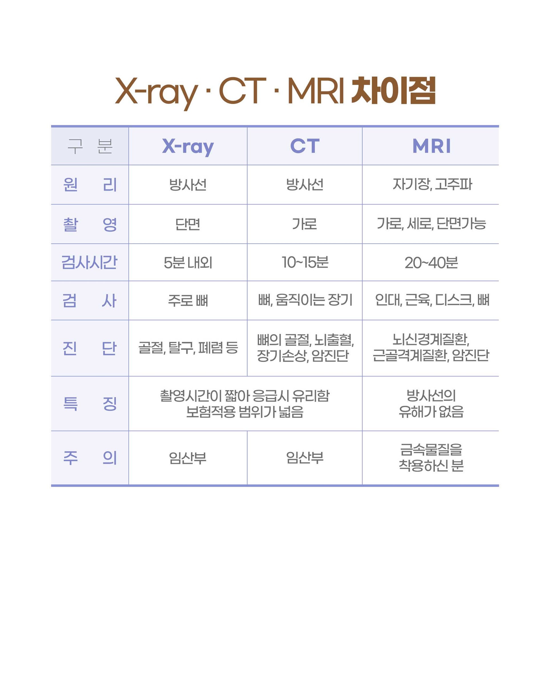 | 구 분 | X-Ray | CT | MRI |