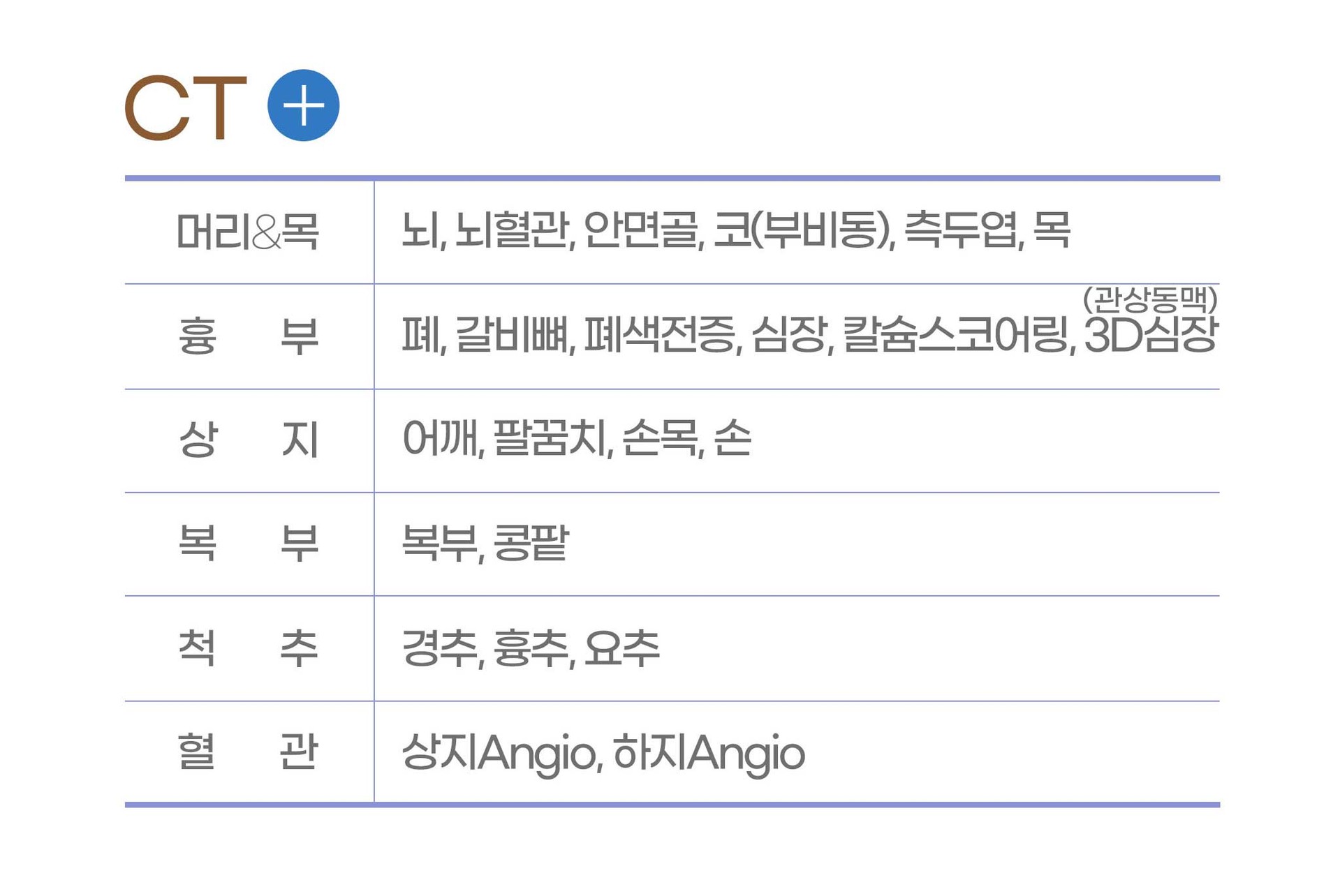 | 진 단 | 골절, 탈구, 골다공증, 폐렴 등 | 뼈의 골절, 뇌출혈, 장기손상, 암진단 | 뇌신경계·근골격계·암진단 |