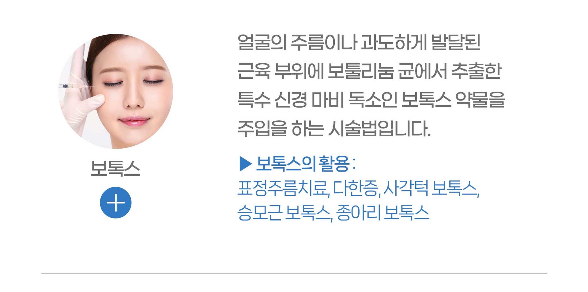 표정주름치료, 다한증, 사각턱보톡스, 종아리보톡스, 승모근보톡스 등
