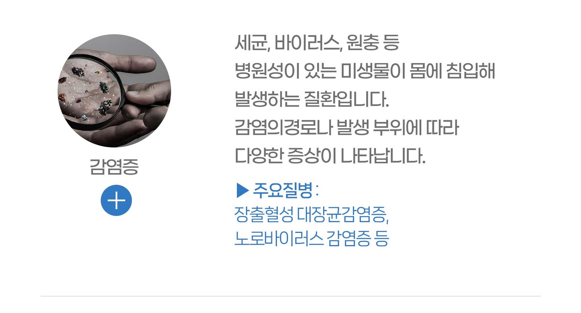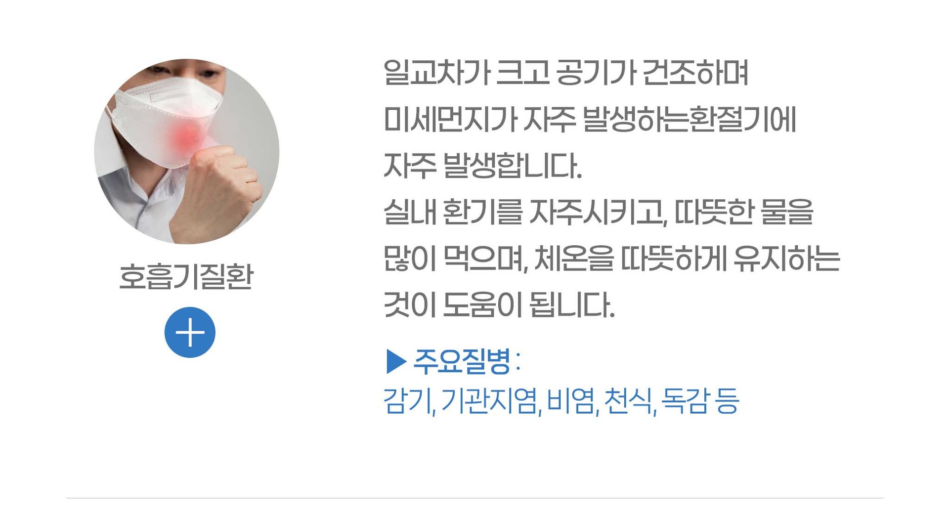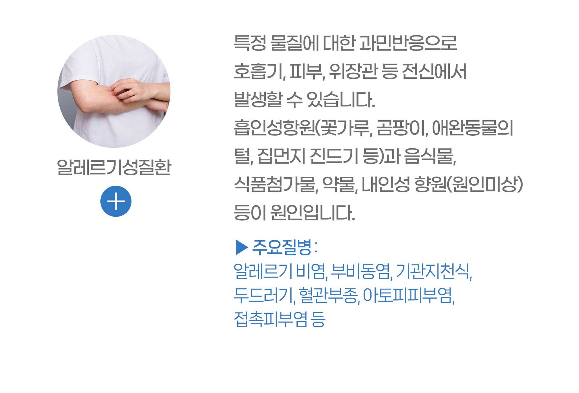 감기증상, 소화기증상, 방광염, 두통, 피로감, 가슴통증, 알레르기 비염, 구내염, 입술포진, 대상포진, 두드러기, 빈혈, 갑상선질환, 근골격계 통증 등