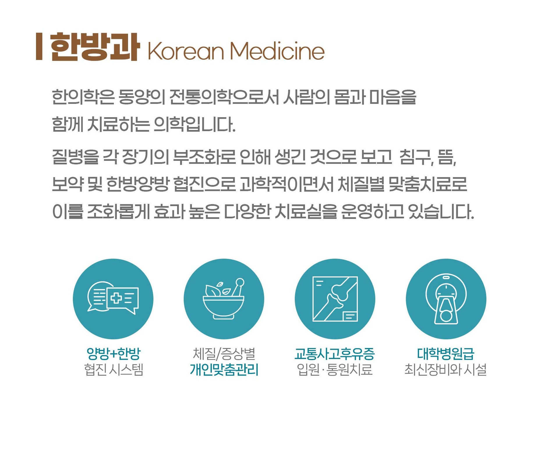 양·한방 협진 시스템을 통해 보다 폭넓고 균형 있는 진료를 제공하며,