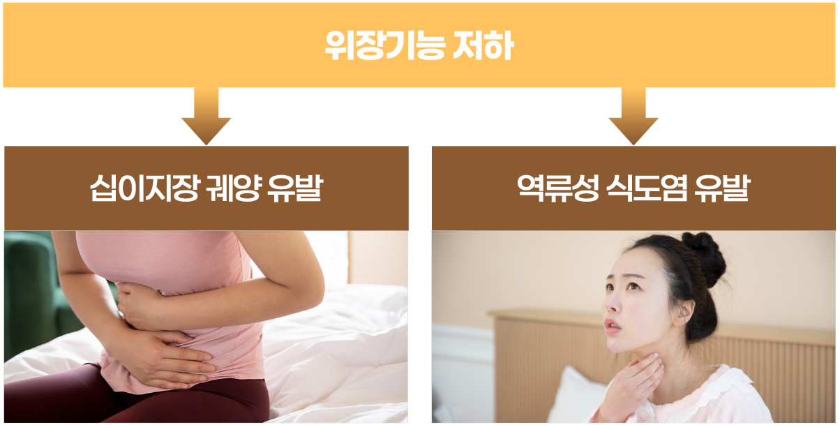 위장의 기능이 저하되면 위로는 식도에 영향을 끼치고, 아래로는 십이지장에 영향을 끼치게 됩니다.