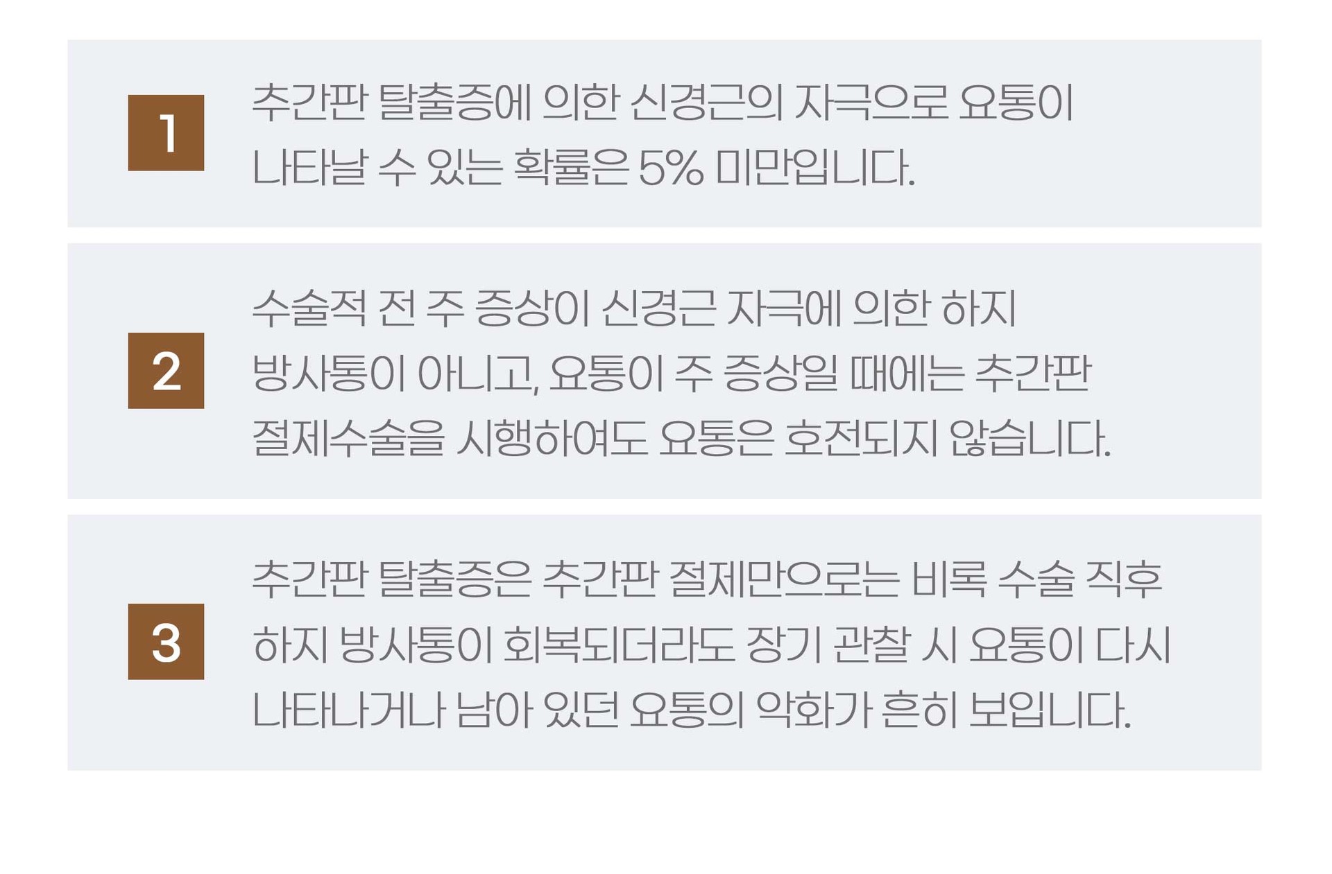 수술적 전 주 증상이 신경근 자극에 의한 하지 방사통이 아니고, 요통이 주 증상일 때에는 추간판 절제수술을 시행하여도 요통은 호전되지 않습니다.