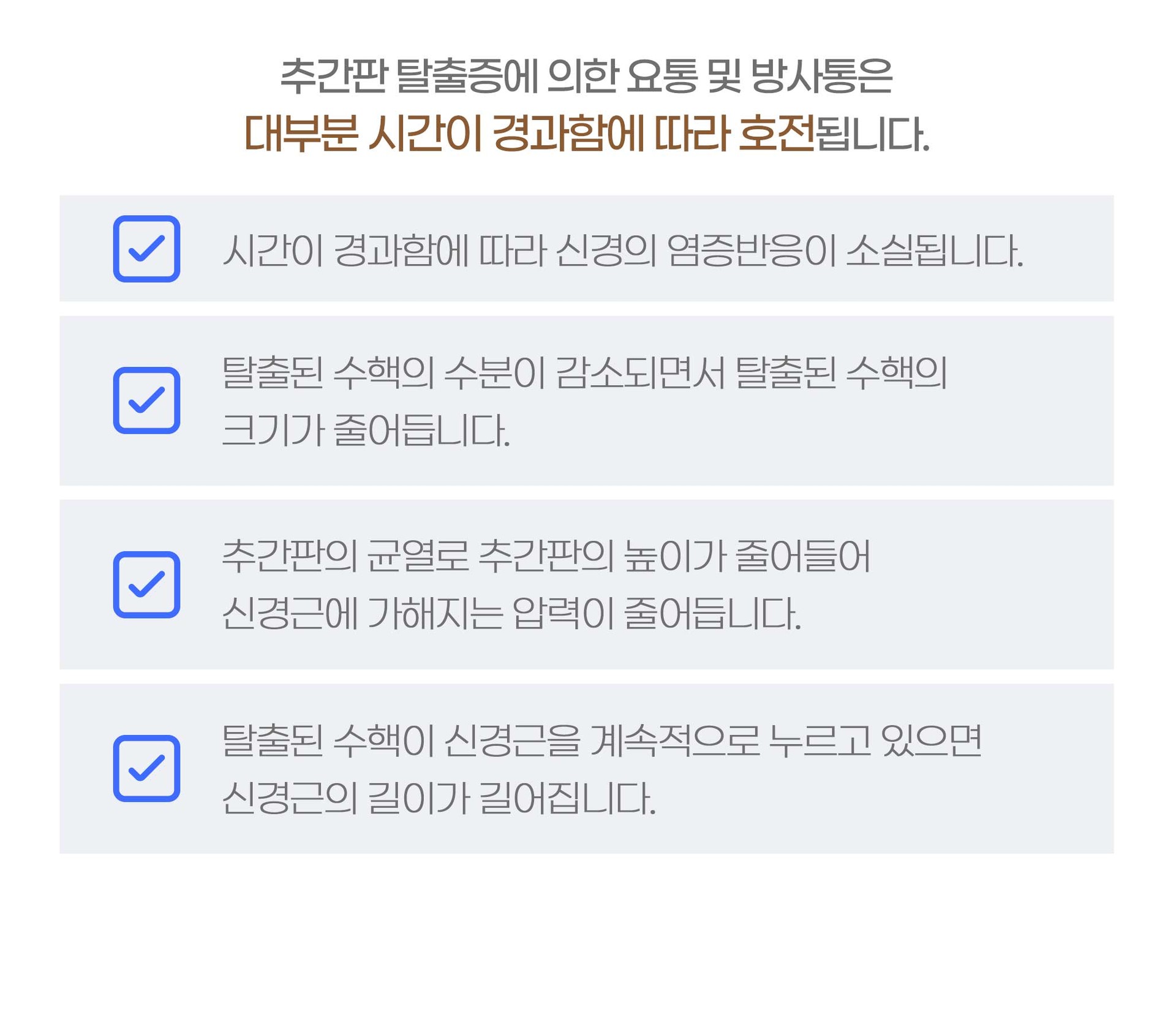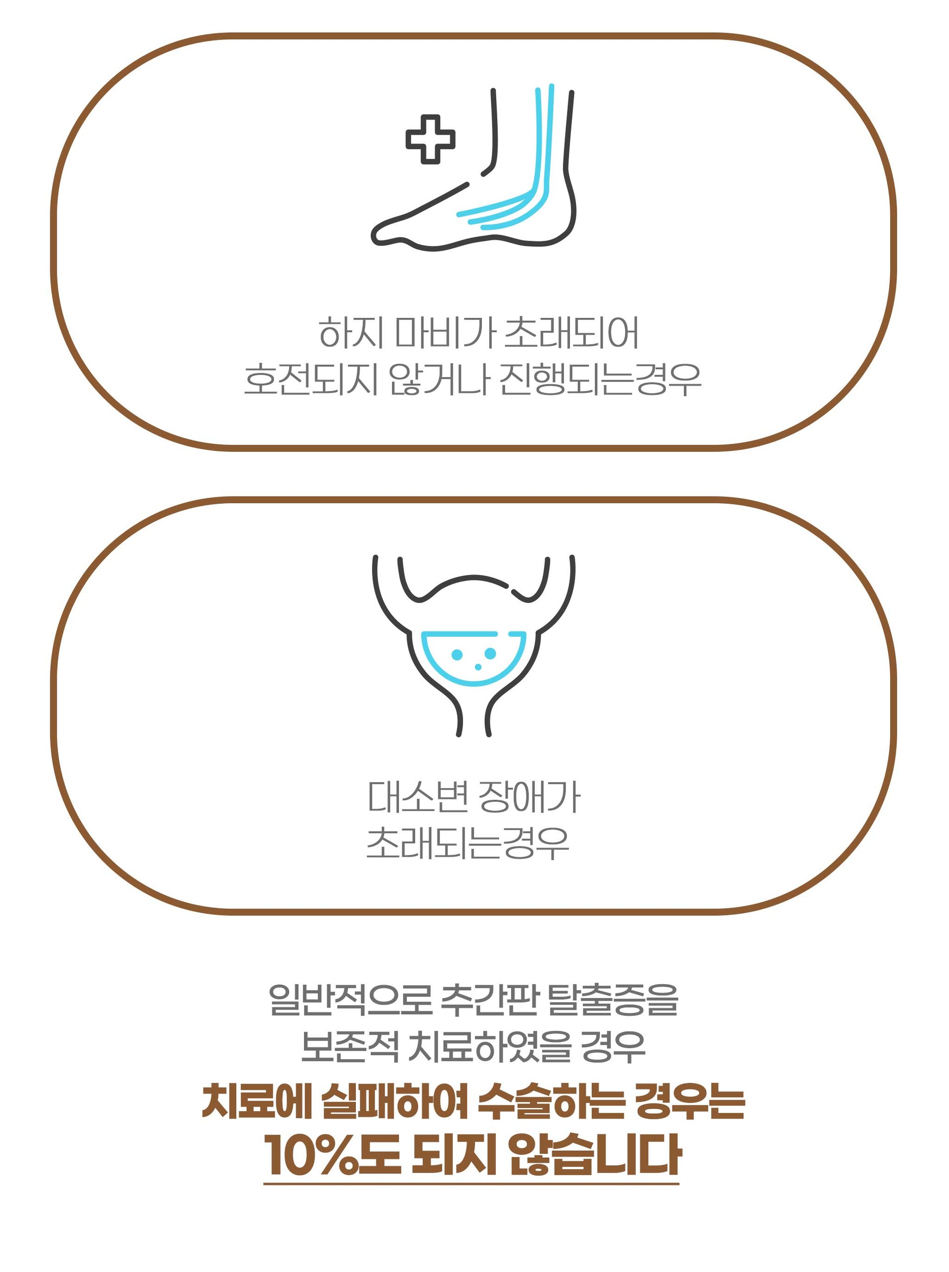 추간판 탈출증은 추간판 절제만으로는 비록 수술 직후 하지 방사통이 회복되더라도 장기 관찰 시 요통이 다시 나타나거나 남아 있던 요통의 악화가 흔히 보입니다.디스크 보존적 치료의 예후