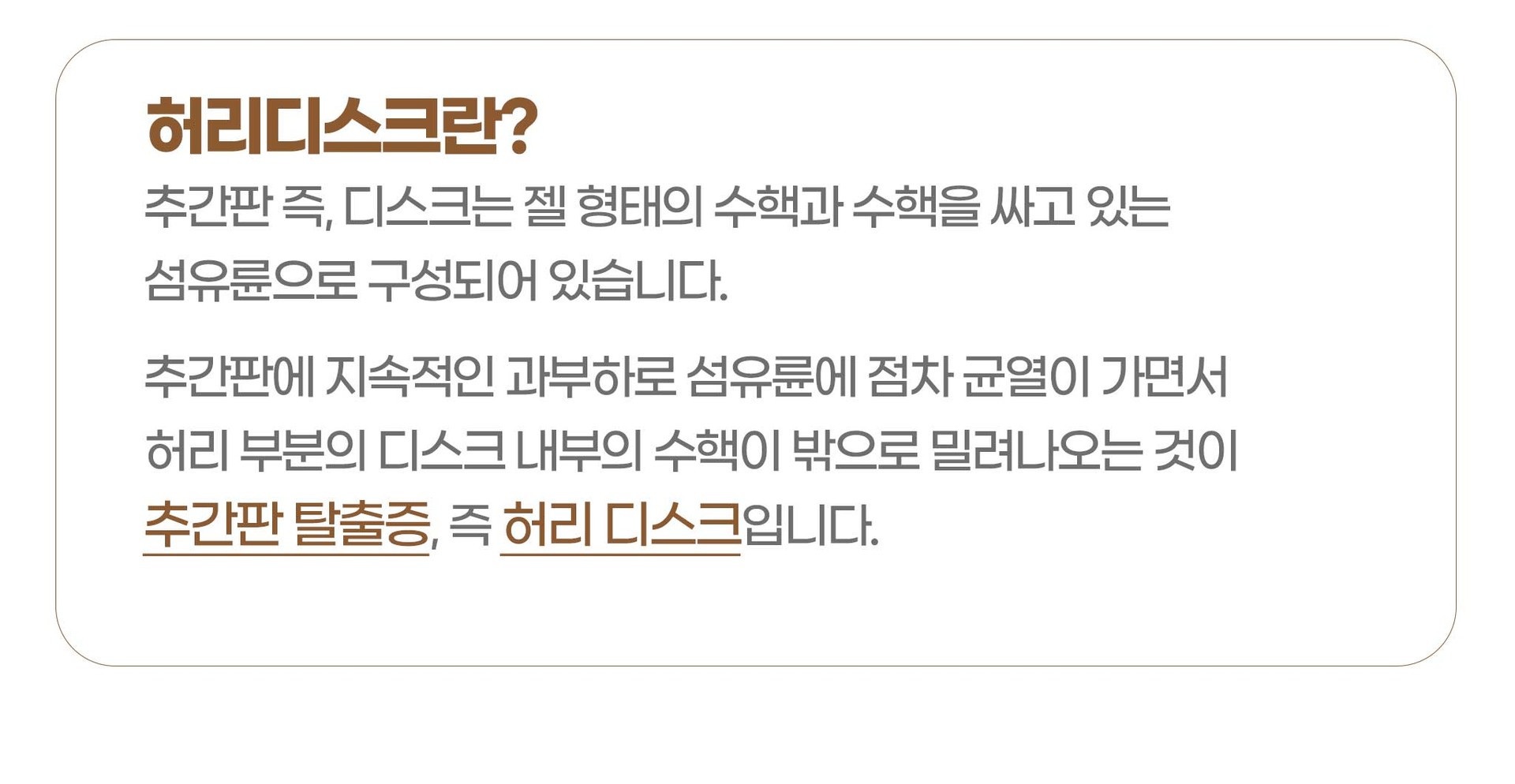 추간판 즉, 디스크는 젤 형태의 수핵과 수핵을 싸고 있는 섬유륜으로 구성되어 있습니다.