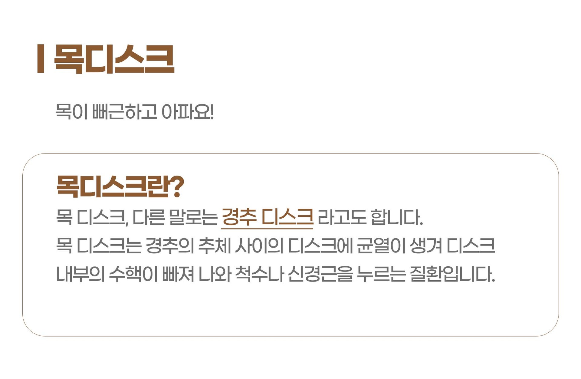 목 디스크는 경추의 추체 사이의 디스크에 균열이 생겨 디스크 내부의 수핵이 빠져 나와 척수나 신경근을 누르는 질환 입니다.