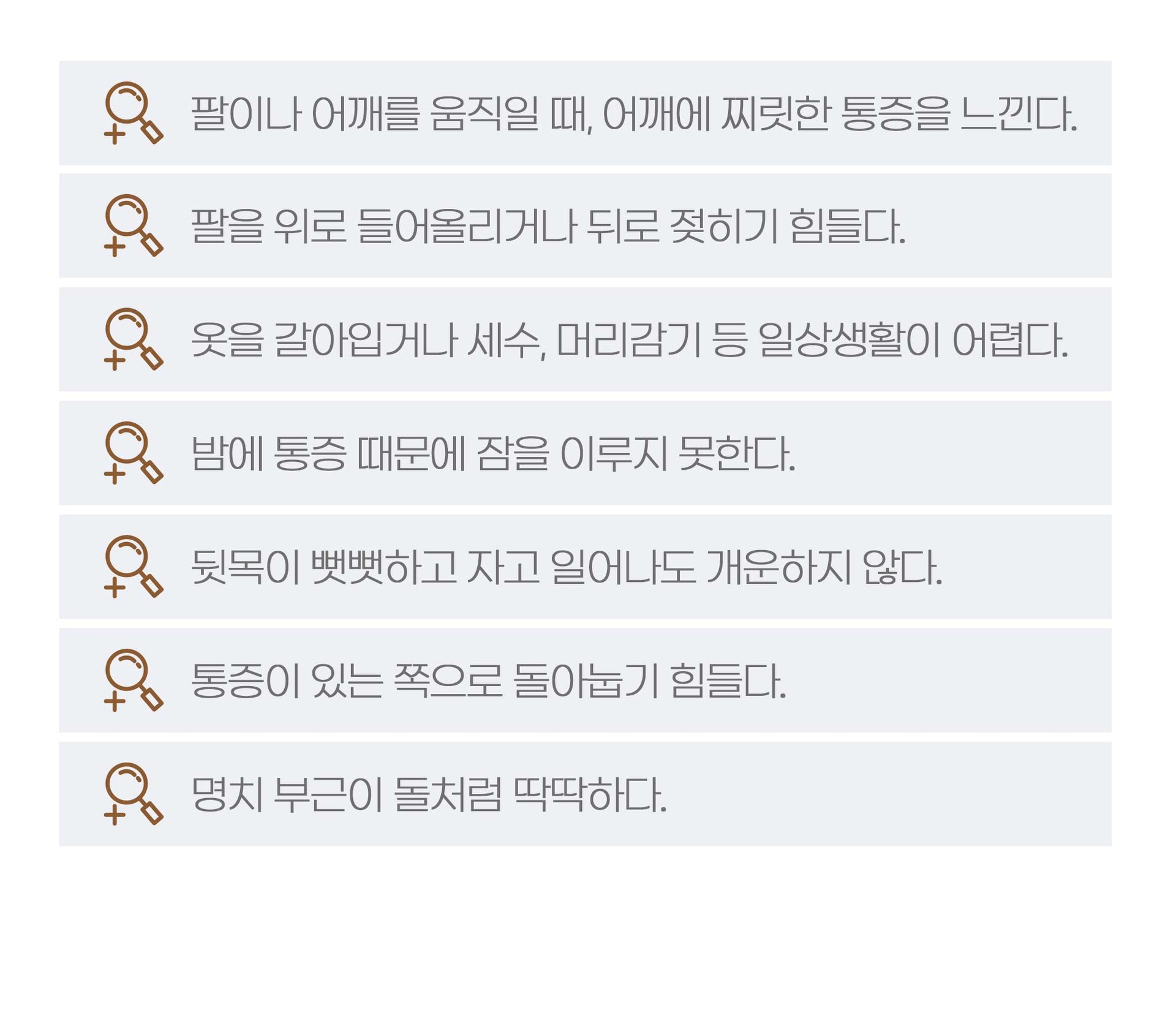 팔이나 어깨를 움직일 때, 어깨에 찌릿한 통증을 느낀다.