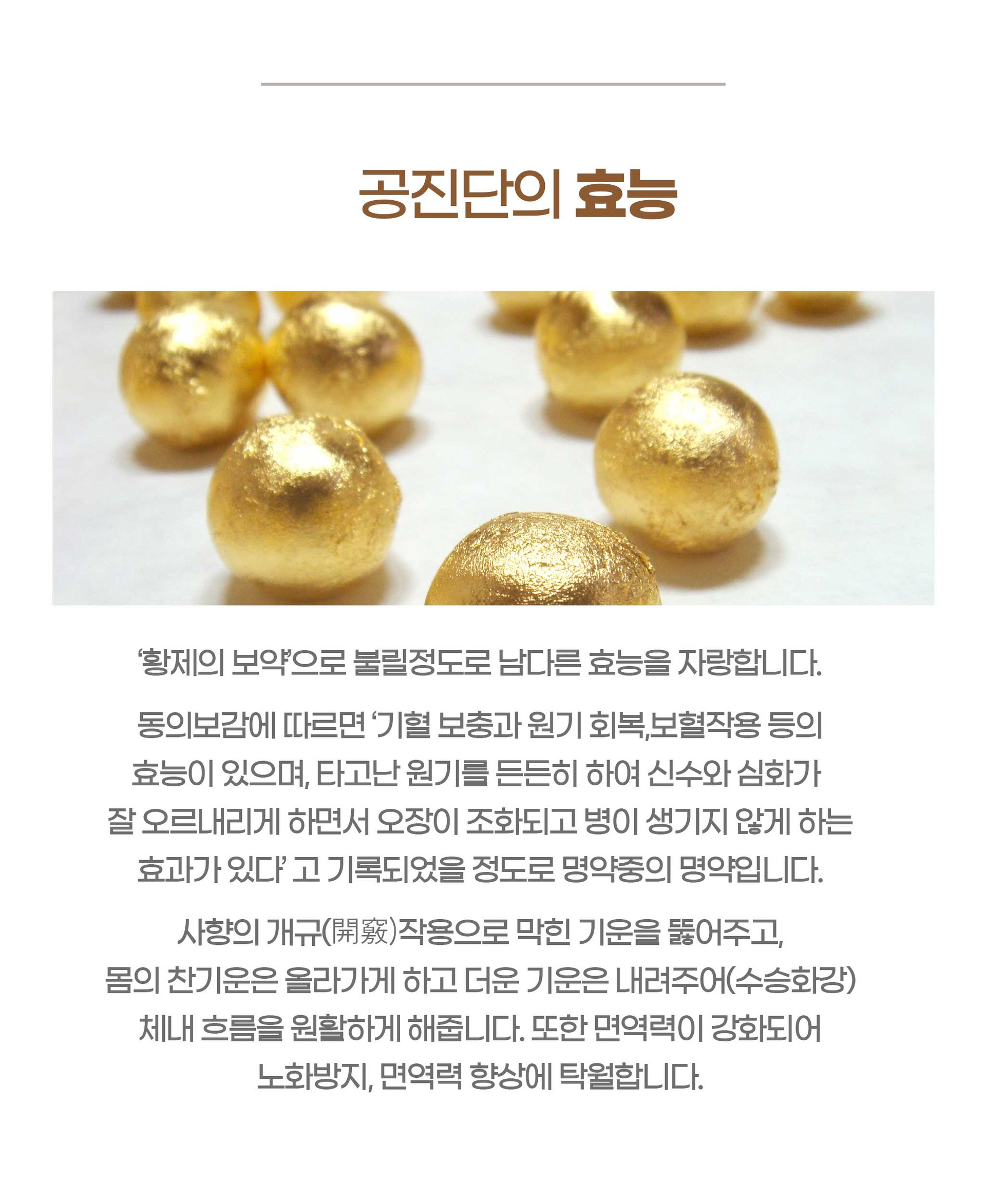 공진단은 사향, 당귀, 산수유의 효능이 함께 작용하여 빠르게 정혈을 채워주고 오장육부 중에서 간허로(肝虛勞)를 극복하는 데 도움을 줍니다.