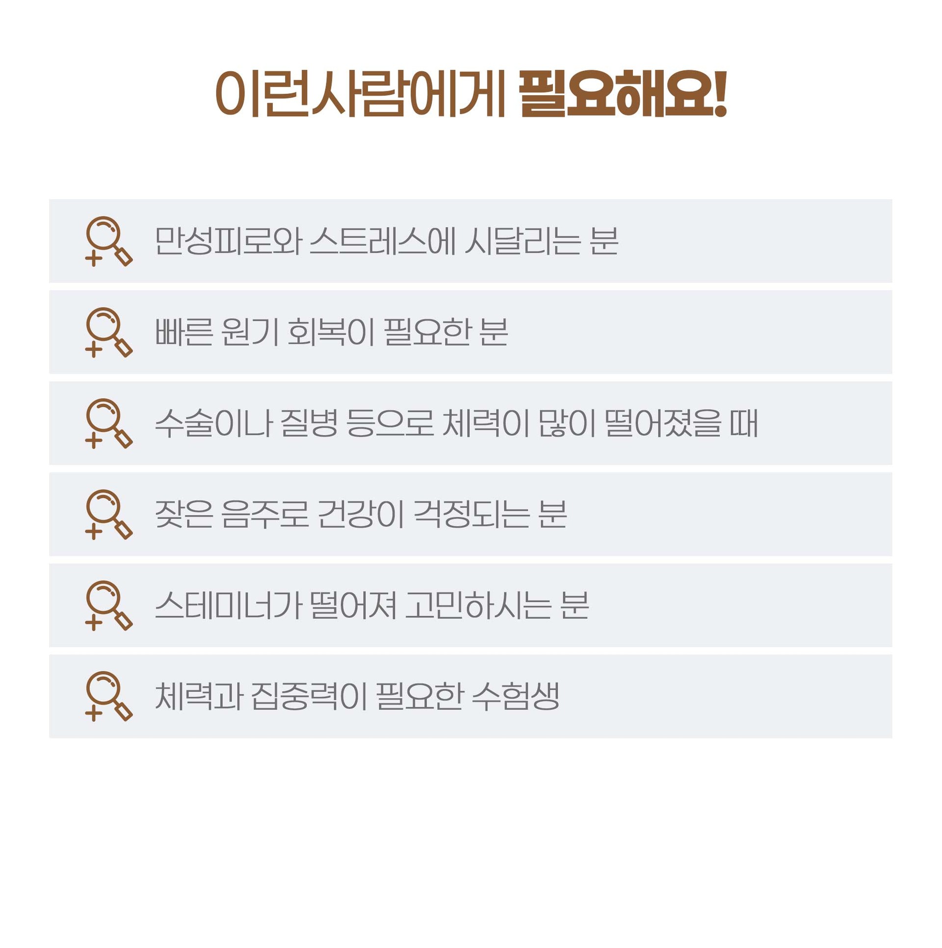 | 간기능 보강 체력 보강 수술 후 보양 | 허약한 체질 잔병 많은 체질 | 성기능 감퇴 성욕 감퇴 | 갱년기 증후군 부인병 |