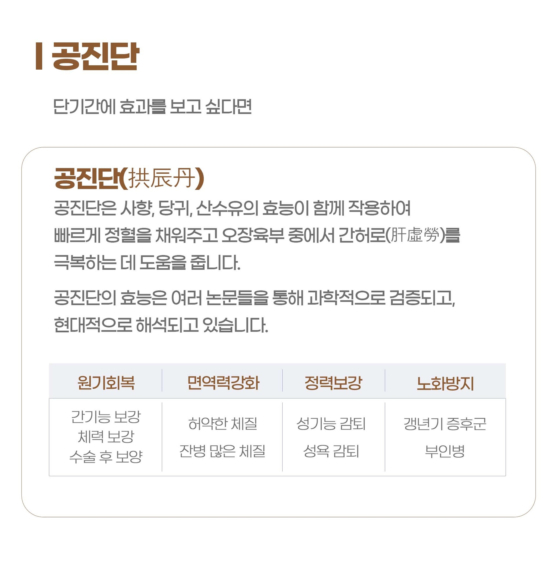 공진단의 효능은 여러 논문들을 통해 과학적으로 검증되고, 현대적으로 해석되고 있습니다.